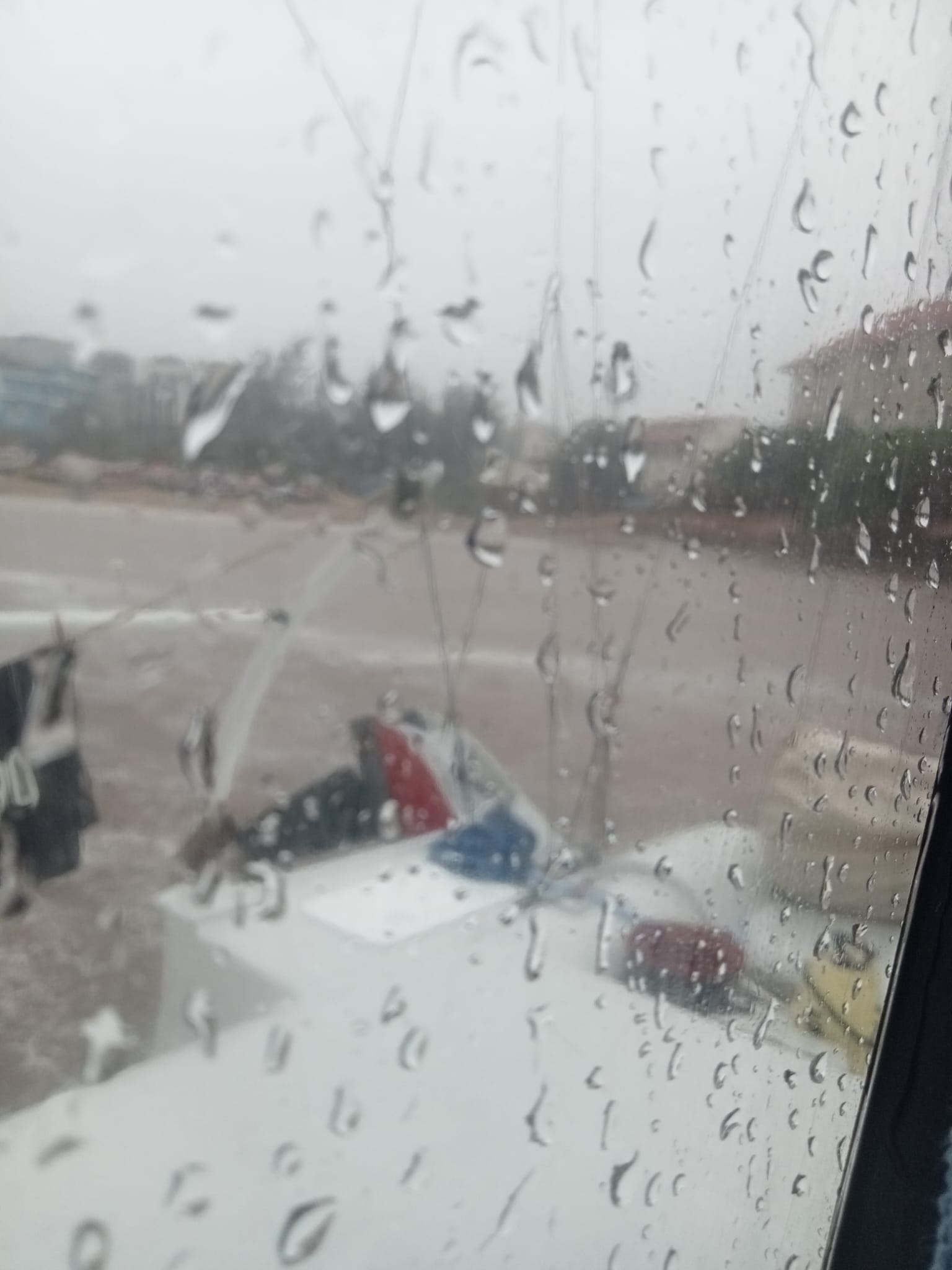 « Oui, on est sensées jouer ce soir mais là c’est déluge, même si on maintient personne ne viendra… Je vous décris un peu : sur la plage en face, celle des pêcheurs où il y a toutes leurs barques, il y a une rue qui descend, les gars des jet skis descendent leur remorque par là. Ben cette rue, c’est devenu une rivière, un torrent même, y’a un sacré débit ! Ça doit lessiver toute la ville cette pluie vu tous les détritus que ça entraîne à l’eau… C’est tellement fort que ça en creuse la plage, comme une falaise qui s’effrite mais en accéléré…