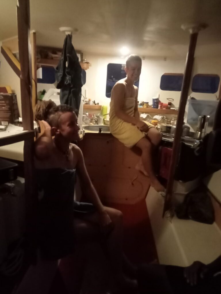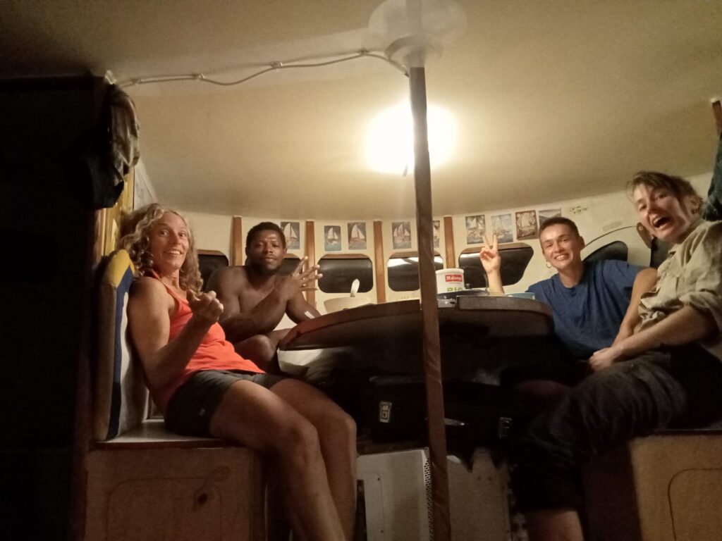 Camille et moi larguons les amarres à l’avant avec l’aide de Edimilson sur le quai avec qui nous communiquons par gestes pendant que Anne largue le coffre arrière et l’ancre reliée au bateau de Jaïr avant que nous ne partions avec ! On verra plus tard pour récupérer cette ancre abandonnée, là il y a urgence. Puis nous nous déhalons sur la dernière ancre qu’il nous reste avec Anne qui joue sur les moteurs pour faire une marche arrière et nous aider.